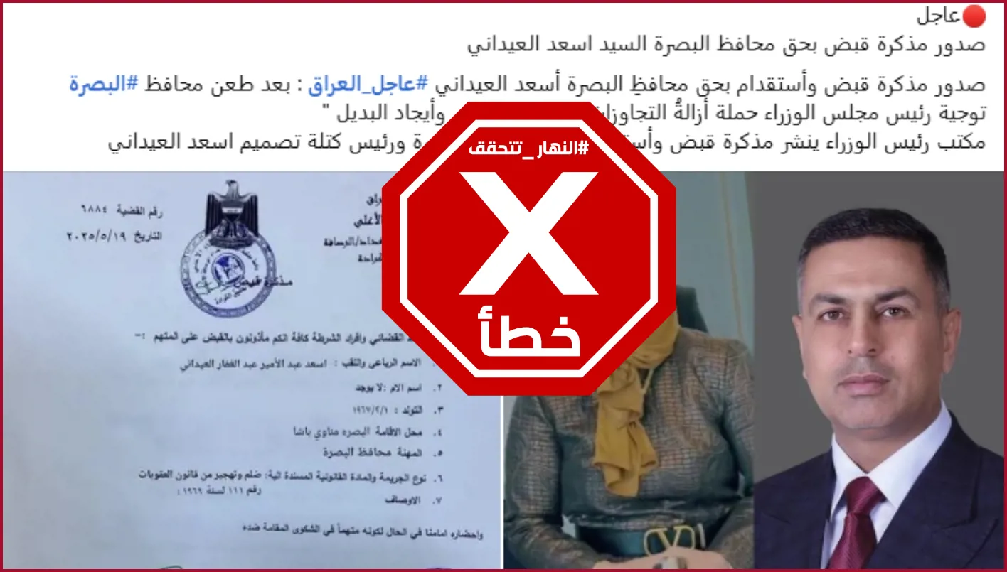 تتداول العديد من الصفحات على مواقع التواصل الاجتماعي خبراً يدّعي أنَّ مذكرة إلقاء قبض واستقدام صدرت بحق محافظ البصرة أسعد العيداني، بالتزامن مع الخلاف الذي نشب بينه وبين رئيس الوزراء العراقي محمد شياع السوداني بشأن قضية رفع المنازل المخالفة في محافظة البصرة جنوب العراق. إلا أنَّ الخبز خاطئ، والوثيقة المتداولة مفبركة. وأكد مجلس القضاء الأعلى انها "مزوّرة". FactCheck#