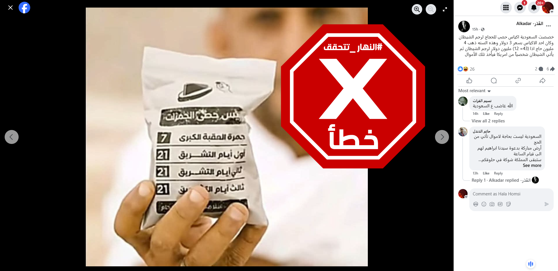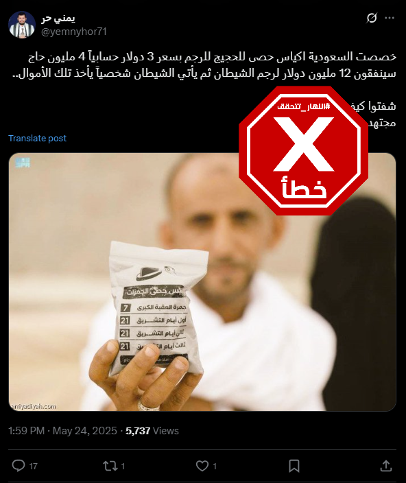 الحقيقة: هذا الخبر لا صحة له. وحافظات حجارة رمي الجمار تؤمّن للحجاج مجاناً. FactCheck#