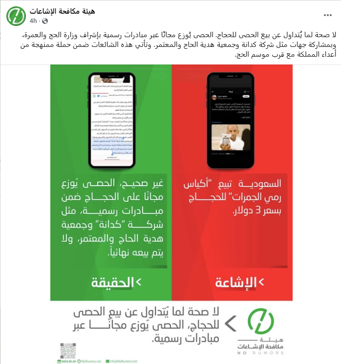 بعد انتشار الخبر في وسائل التواصل، اكدت هيئة مكافحة الاشاعات أن "لا صحة لما يُتداول عن بيع الحصى للحجاج. والحصى يُوزع مجانًا عبر مبادرات رسمية، بإشراف وزارة الحج والعمرة، وبمشاركة جهات، مثل شركة كدانة وجمعية هدية الحاج والمعتمر". وقالت: "تأتي هذه الشائعات ضمن حملة ممنهجة من أعداء المملكة مع قرب موسم الحج".