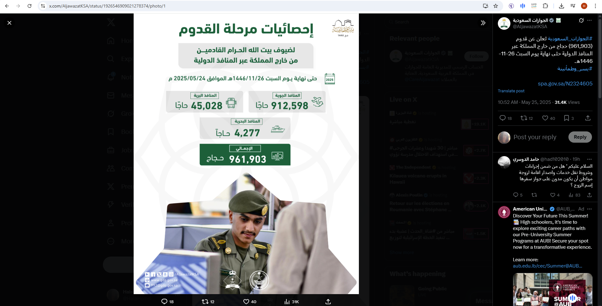 وبلغ إجمالي ضيوف الرحمن الآتين من الخارج، عبر جميع المنافذ الجوية والبرية والبحرية للمملكة العربية السعودية، حتى نهاية السبت 25 ايار 2025، 961.903 آلاف حاج، وفقاً لما أعلنت المديرية العامة للجوازات السعودية. وفي الارقام المفصلة، وصل 912.598 ألف حاج عبر المنافذ الجوية، و45.28 الفا عبر المنافذ البرية، و4.277 ألفاً عبر المنافذ البحرية.