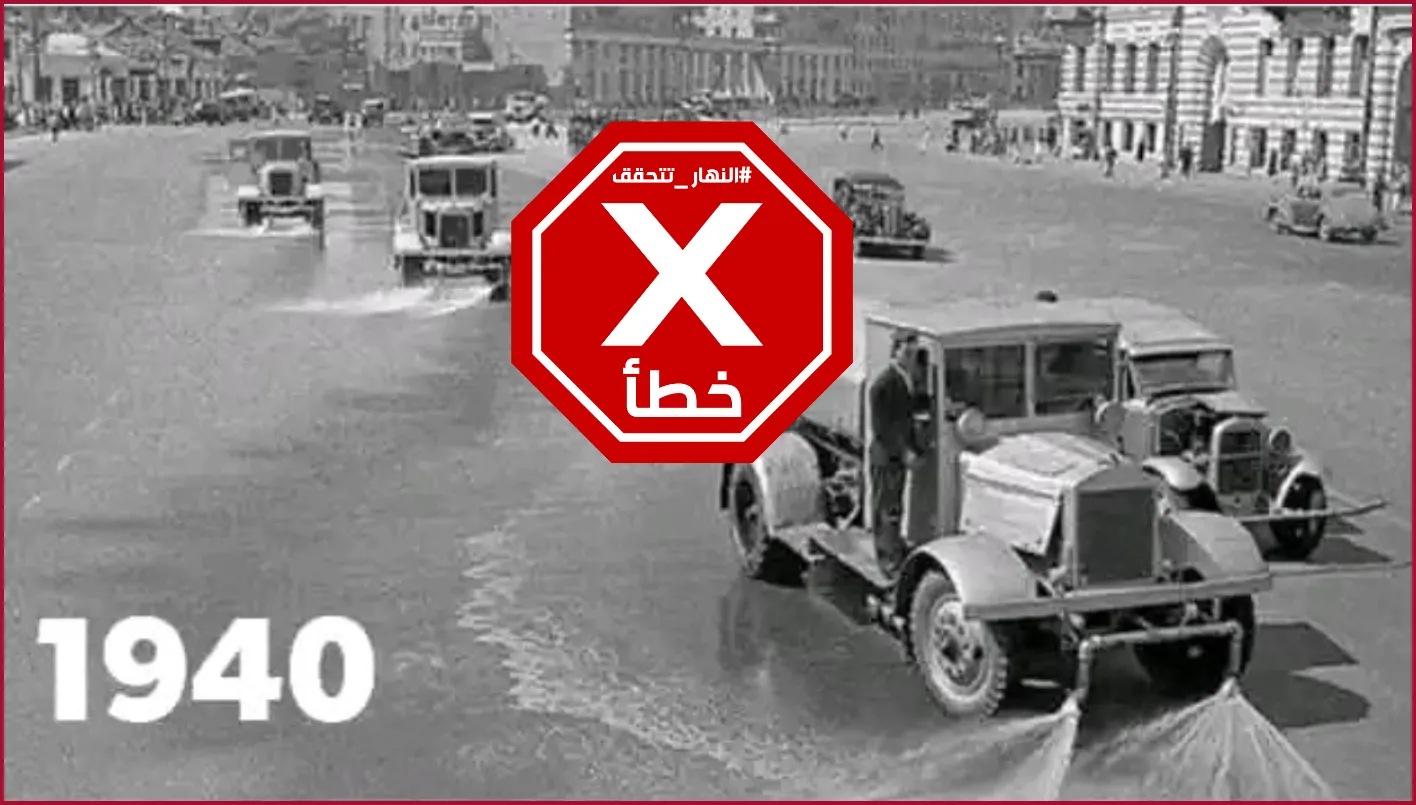 نشرت صفحات وحسابات على مواقع التواصل الاجتماعي ولا سيّما في مصر صورة مزدوجة قيل إن الجزء الأول منها، الذي يُظهر عربات تُنظّف شارعاً عريضاً، مصوّر في القاهرة عام 1940، وإن الجزء الثاني منها، الذي يُظهر رجلاً قرب جِمال في صحراء، مصوّر في الإمارات، في مقارنة بين ما كان عليه حال البلدين في القرن الماضي وما صار عليه الآن. صحيح أن مصر شهدت في النصف الأول من القرن العشرين نهضة عمرانية، إضافة إلى النهضة الثقافية والفنية، لكن الصورة التي قيل إنّها ملتقطة في القاهرة عام 1940 مصوّرة في الحقيقة في موسكو عام 1944.