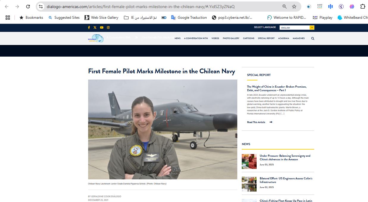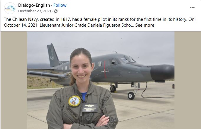 فالبحث العكسي يوصلنا إلى موقع dialogo-americas، الذي نشر الصورة في 23 كانون الأول 2021، بكونها تظهر الملازمة دانييلا فيغيروا شولتز Daniela Figueroa Scholz، "أول قائدة طائرة في البحرية التشيلية"، وفقاً لما عرّف بها.