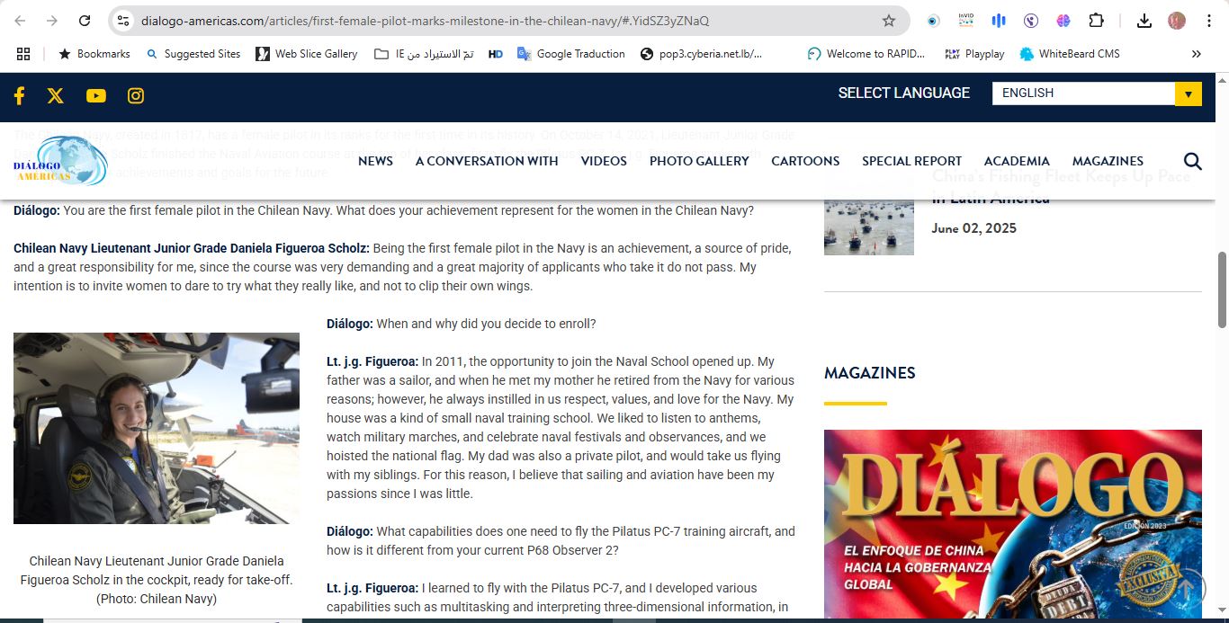 وأجرى الموقع مقابلة مع الملازمة فيغيروا شولتز، وسألها عن إنجازاتها وأهدافها المستقبلية. ومما قالته: "كوني أول قائدة طائرة في البحرية التشيلية يُعد إنجازًا وفخرًا ومسؤولية كبيرة بالنسبة اليّ، لأن الدورة كانت شاقة للغاية، وأغلبية المتقدمات لم ينجحن. وهدفي هو دعوة النساء الى المغامرة وتجربة ما يحلو لهن".