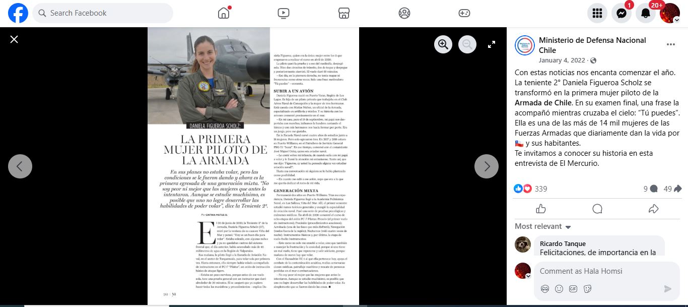في 4 كانون الثاني 2022، خصّت وزارة الدفاع التيشيلة الملازمة فيغيروا شولتز بمنشور في صفحتها في الفايسبوك، قالت فيه: "نحب أن نبدأ العام بهذه الأخبار. أصبحت الملازمة الثانية دانييلا فيغيروا شولتز أول قائدة طائرة في البحرية التشيلية. في امتحانها النهائي، رافقتها عبارة واحدة وهي تعبر السماء: "يمكنك أن تفعل ذلك". إنها واحدة من أكثر من 14 الف امرأة في القوات المسلحة اللواتي يضحين بحياتهن يوميًا من أجل تشيلي وسكانها".