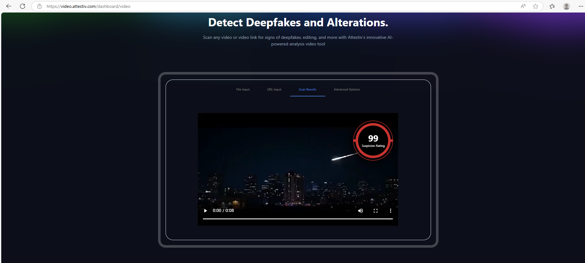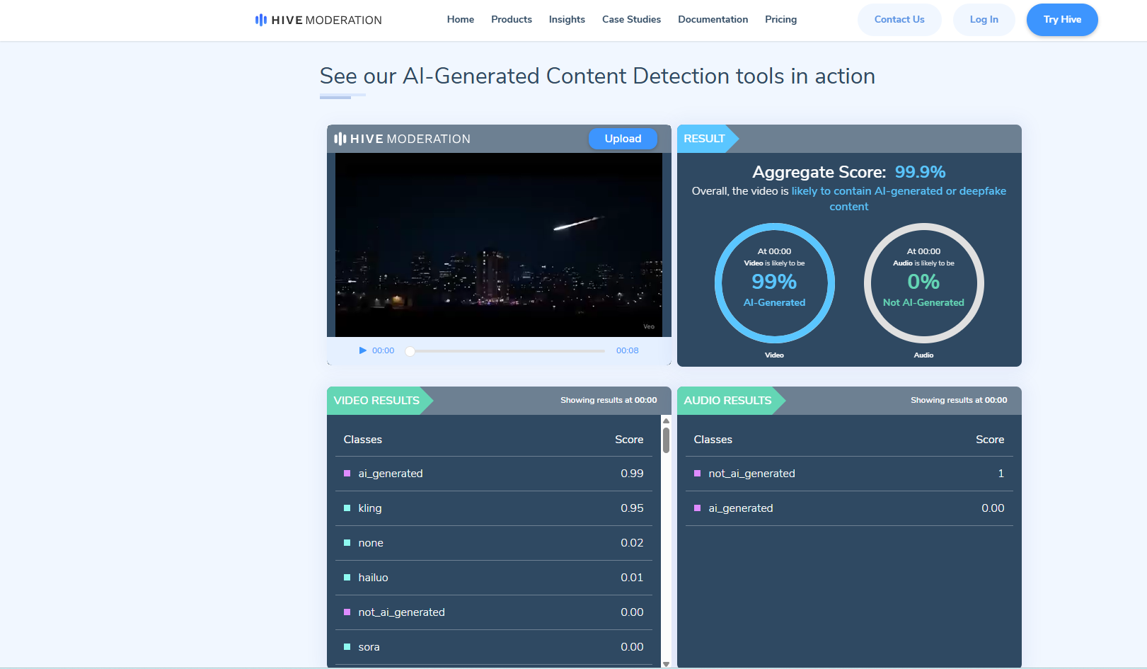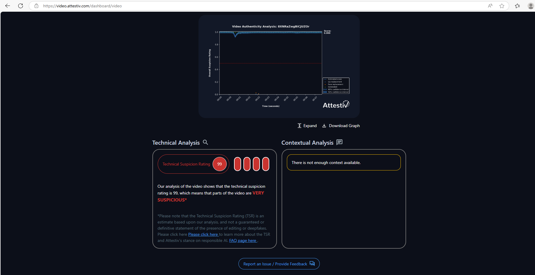ويدعم هذا الاستنتاج فحص الفيديو في مواقع متخصصة بكشف الفيديوات الزائفة، مثل Hive Moderation وVideo Attestiv، والذي جاءت نتيجته ان الفيديو مولد بالذكاء الاصطناعي بنسبة 99.9%.