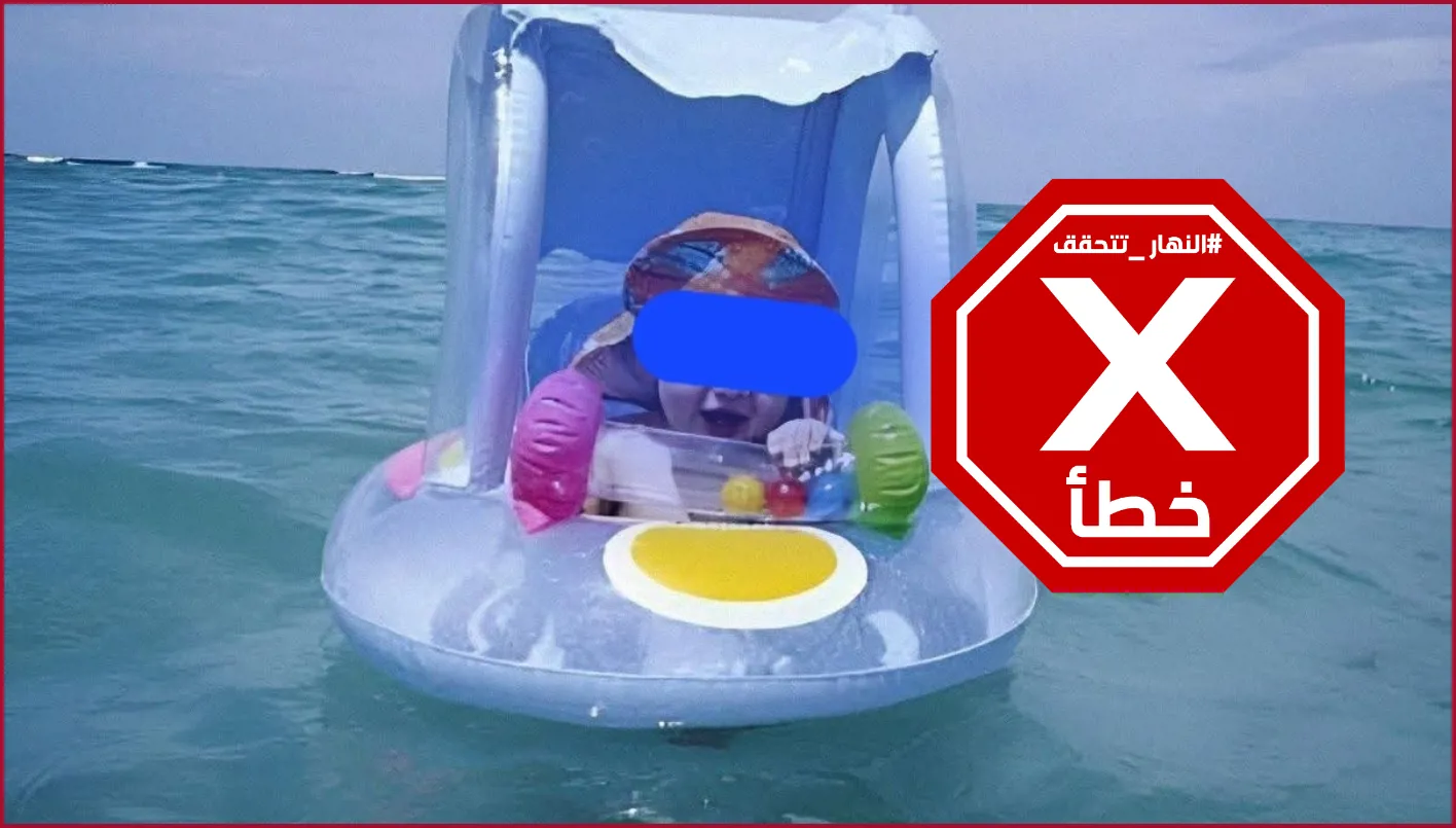الحقيقة: هذه الصورة التي نشرتها وكالة "غيتي ايماجيز" في ايلول 2005، تظهر طفلا يطفو على عوامة للصغار في المحيط، عند شاطئ هوب ساوند بفلوريدا في الولايات المتحدة الأميركية. FactCheck#