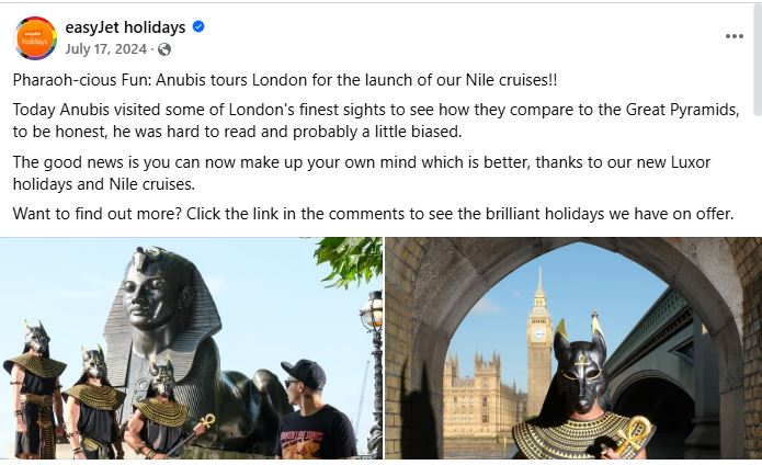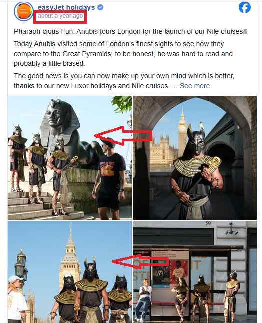 حينها، نشرت الشركة على حسابها الرسمي في فايسبوك مجموعة من هذه الصور. وكتبت معها (من دون تدخل): "متعة فرعونية: أنوبيس يجول في لندن بمناسبة إطلاق رحلاتنا النيلية! زار أنوبيس اليوم بعضًا من أجمل معالم لندن، ليرى كيف تُقارن بالأهرامات العظيمة... الخبر السار هو أنه يمكنك الآن اتخاذ قرارك الخاص بشأن الأفضل، بفضل عطلاتنا الجديدة في الأقصر ورحلاتنا النيلية".
