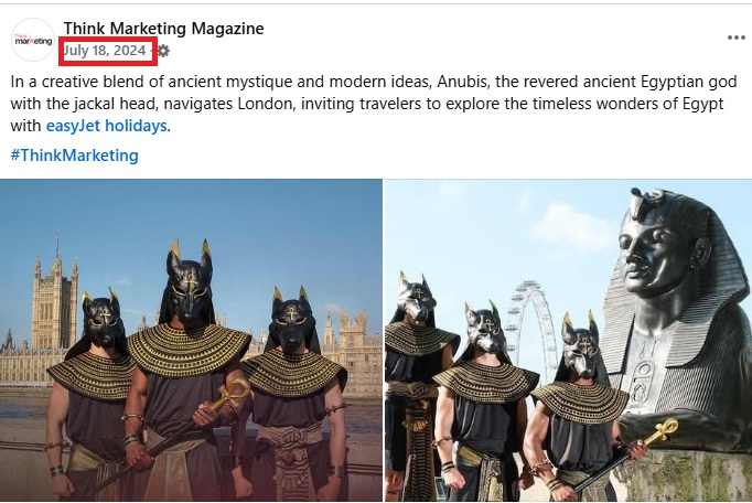 كذلك، تداولت حسابات على فايسبوك، في اليوم التالي، أي في 18 تموز 2024، تلك الصور، إضافة إلى أخرى. وكتبت معها (من دون تدخل): "في مزيج إبداعي من الغموض القديم والأفكار الحديثة، يتجول أنوبيس، الإله المصري القديم الموقر برأس ابن آوى، في لندن، ويدعو المسافرين إلى استكشاف عجائب مصر الخالدة، مع عطلات إيزي جيت".