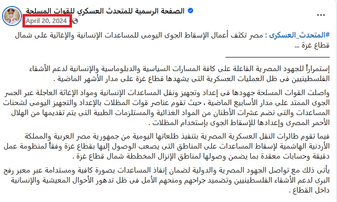 وفي التاريخ ذاته، نشرت الصفحة الرسمية للمتحدث الرسمي للقوات المسلحة المصرية على فايسبوك بيانا جاء فيه أن القوات المسلحة المصرية واصلت جهودها في إعداد المساعدات الإنسانية ومواد الإغاثة العاجلة وتجهيزها ونقلها عبر الجسر الجوي الممتد على مدار الأسابيع الماضية.