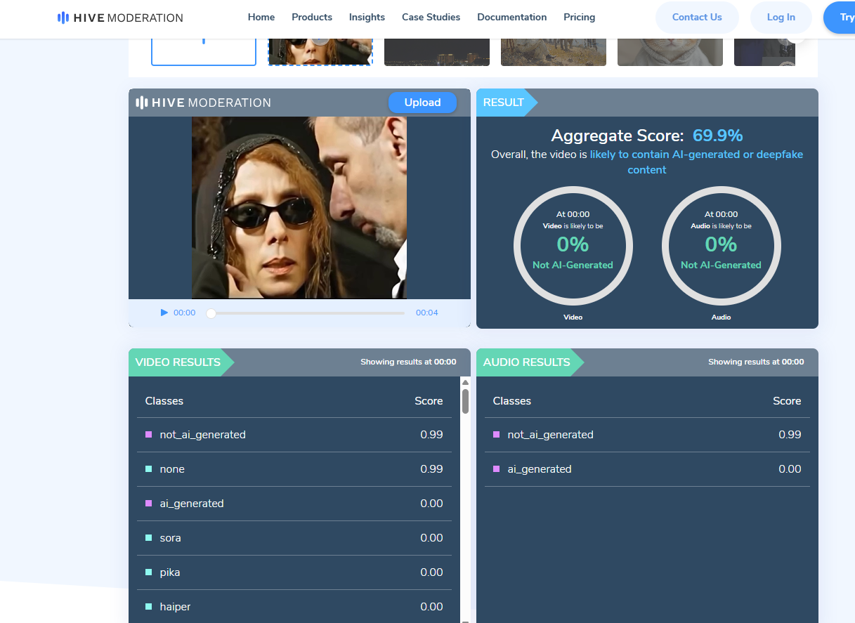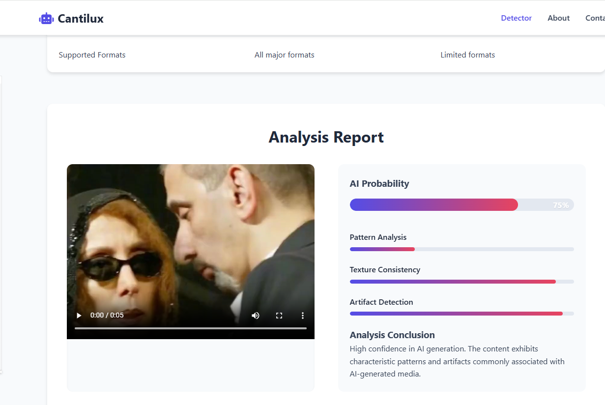 وتدعم هذا الاستنتاج نتيجة فحص الفيديو في مواقع متخصصة بكشف الفيديوات الزائفة، مثل Hive Moderation وCantilux وvideo.attestiv، وجاءت انه منشأ على الارجح بالذكاء الاصطناعي بنسبة عالية وصلت الى 69.9%، وفقا للموقع الاول، و75% في الموقع الثاني، بينما حدّد الثالث تصنيف الاشتباه الفني بـ85، مما يعني أن أجزاء من الفيديو مشبوهة للغاية.