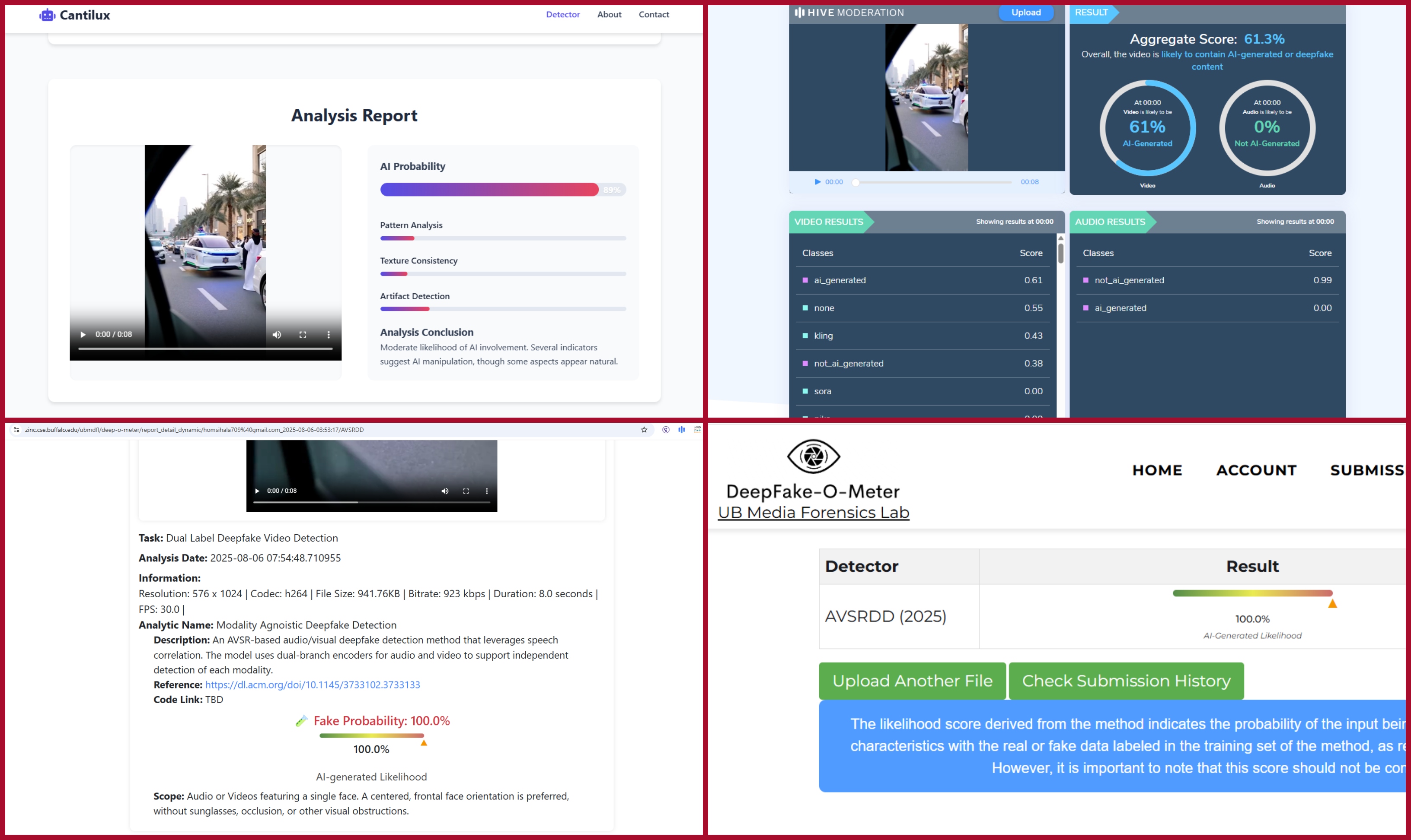 وتدعم هذا الاستنتاج نتيجة فحص الفيديو في مواقع وبرامج متخصصة بكشف الفيديوات الزائفة، مثل Hive Moderation وCantilux وDeep Fake O meter، والتي جاءت انه مولد بالذكاء الاصطناعي بنسبة عالية (61.3% و89%) في الموقعين الاولين، وبنسبة 100% في برنامج Deep Fake O meter الذي تؤمنه جامعة بافالو.
