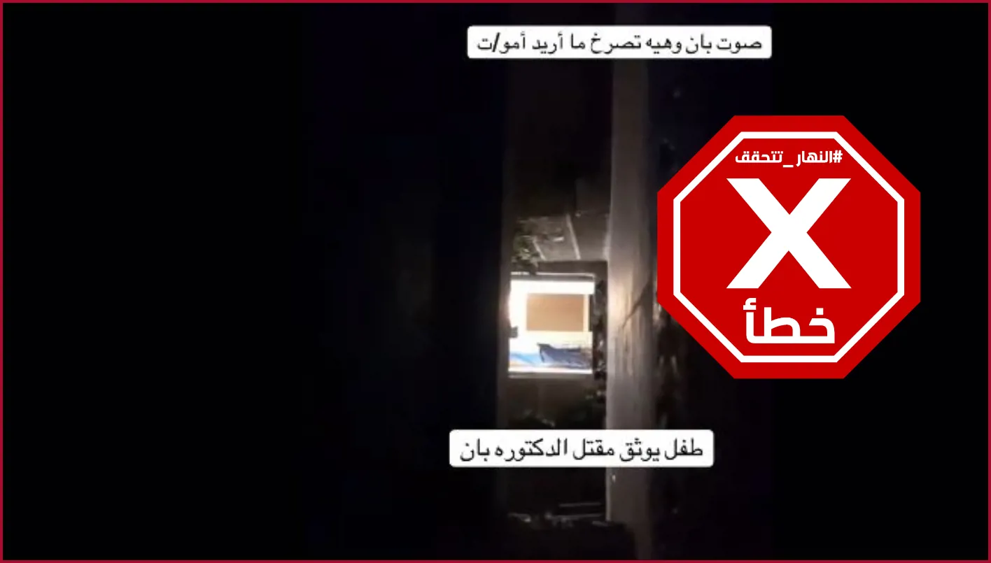 في الادّعاء المتداول، فيديو مصوّر ليلاً من تحت باب كما يتّضح، ويسمع فيه صياح بينما تردد "ما أريد أموت". وقد ارفق بتعليق (من دون تدخّل): "صوت بان وهيه تصرخ ما أريد أموت. طفل يوثق مقتل الدكتوره بان".