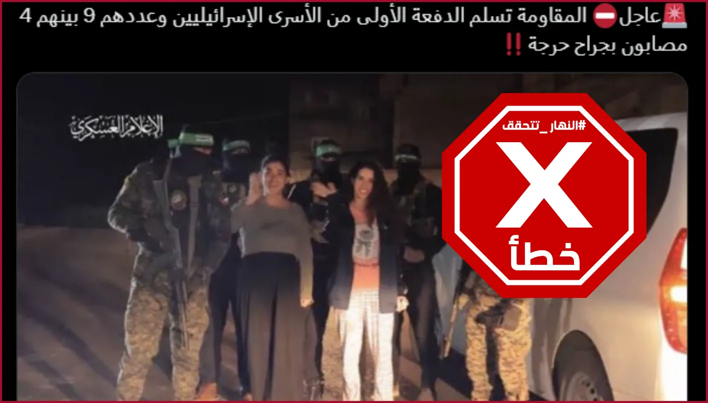 تظهر الصورة الليلية عناصر مسلحين تجمعوا حول فتاتين قرب سيارة. وقد انتشرت خلال الساعات الماضية في حسابات كتبت معها (من دون تدخل): "عاجل- المقاومة تسلم الدفعة الأولى من الأسرى الإسرائيليين وعددهم 9...".