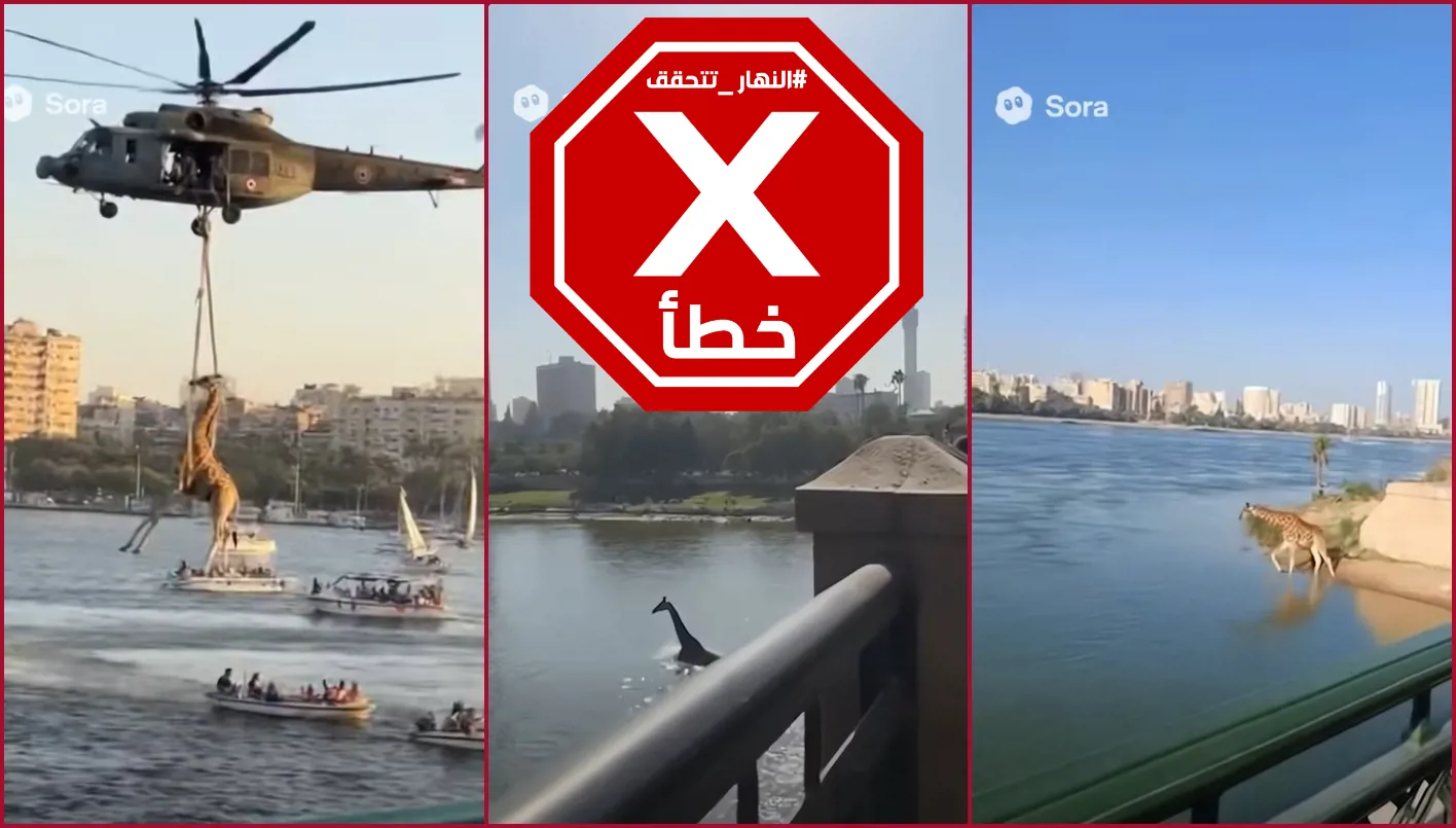 الى جانب ذلك، نعثر على هذين المقطعين منشورين في صفحة Sora Arabic في الفايسبوك، الاول في 20 تشرين الاول 2025، مع تعليق: "يا لهوي، زرافة نزلت إلى النيل عند كوبري قصر النيل ومشيت فيه"، و"الفيديو مصنوع بالذكاء الاصطناعي للمرح فقط". والآخر بعد ساعات عدة من الاول في اليوم ذاته، وكتبت معه الصفحة: "خلاص الزرافة اللي نزلت النيل بيرفعوها بالطيارة. الفيديو مصنوع بالذكاء الاصطناعي للمرح فقط".