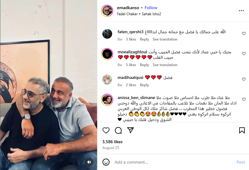 كذلك، نشر محمد شاكر، ابن الفنان، صورة مماثلة في حسابه في انستغرام في 25 آب 2025، مع تعليق: "يا رب خلّي ضحكاته… ما يشوف الهم بحياته". وبدا فيها الرجلان بالثياب ذاتها التي ظهرا فيها في الصورة الاولى.