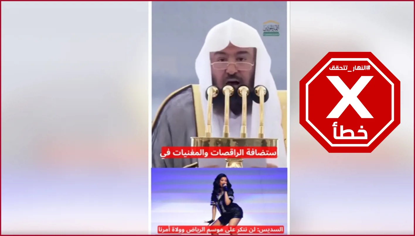 "هناك من يسأل عن استضافة الراقصات والمغنيات في موسم الرياض". كلام في فيديو ظهر فيه إمام وخطيب المسجد الحرام، وتكشف "النّهار" صحّته.