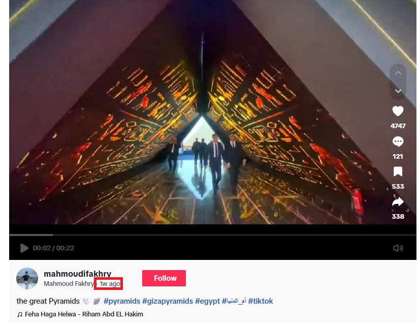 فقد نشره حساب محمود فخري، mahmoudifakhry@، في تيك توك في 22 تشرين الاول 2025، مع تعليق: الأهرامات العظيمة.