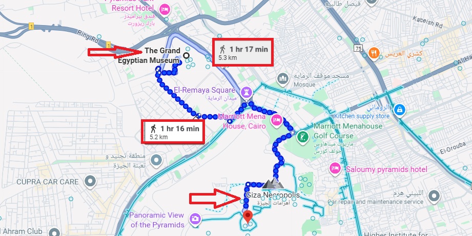 وبالنظر إلى المسافة بين المتحف المصري الكبير ومنطقة الأهرامات الثلاثة على خرائط غوغل، يتّضح أنها تبلغ نحو 5.7 كيلومترات، ويتطلب الوصول إليها سيراً على الأقدام اكثر من ساعة، وهي مسافة أكبر بكثير من تلك التي ظهرت في الفيديو المتداول.