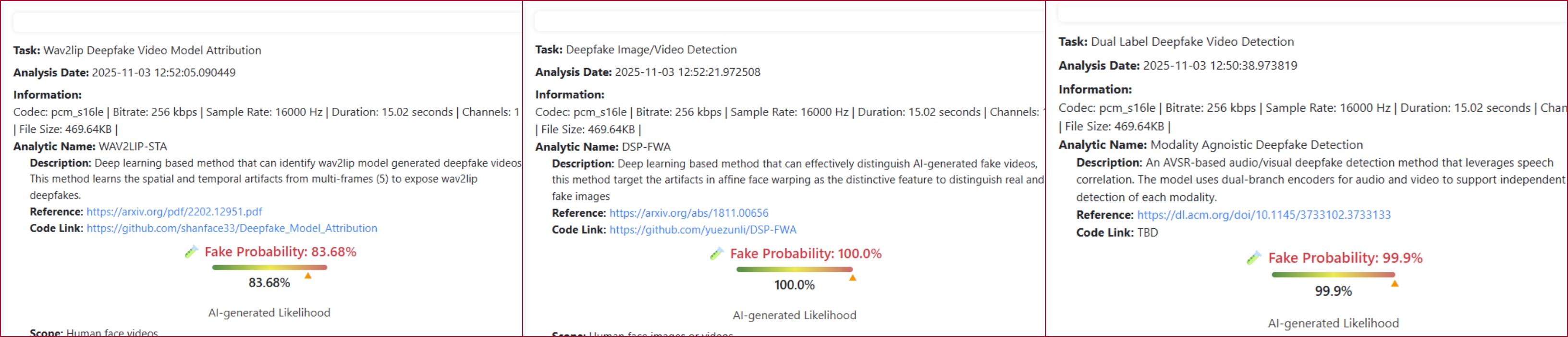 وأعطى فحص المقطع في برنامج DeepFake-O-Meter، الذي تؤمنه جامعة بافالو، نتيجة انه منشأ على الارجح بالذكاء الاصطناعي. وحدّدت اداة اكتشاف الفيديوات الزائفة ذات العلامة المزدوجة نسبة التزييف بـ99.9%، وأداة اكتشاف الصور/الفيديوهات الزائفة بـ100%، وإسناد نموذج فيديو Wav2lip Deepfake بـ83.68%.