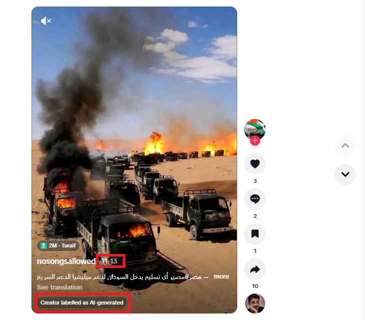الى جانب ذلك، قاد البحث العكسي إلى حساب في تيك توك نشر الصورة بتاريخ 13 تشرين الثاني/نوفمبر الجاري، وصنّفها التطبيق أنها مولدة بالذكاء الاصطناعي.