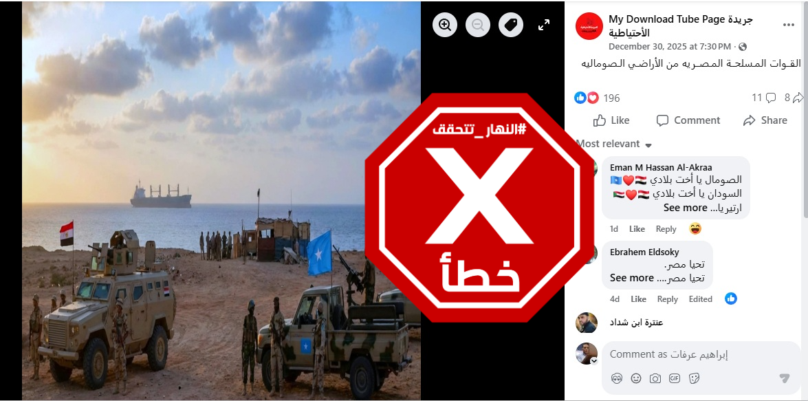 في الواقع، لم تنشرها منصات وزارة الدفاع المصرية الرسمية أو أي مواقع إخبارية صومالية او مصرية، بل تم تداولها على منصات مواقع التواصل، وتحديدا في الفايسبوك بتاريخ 28 كانون الأول/ديسمبر 2025، ضمن منشور على حساب يتحدث عن تطورات الأحداث في الصومال.