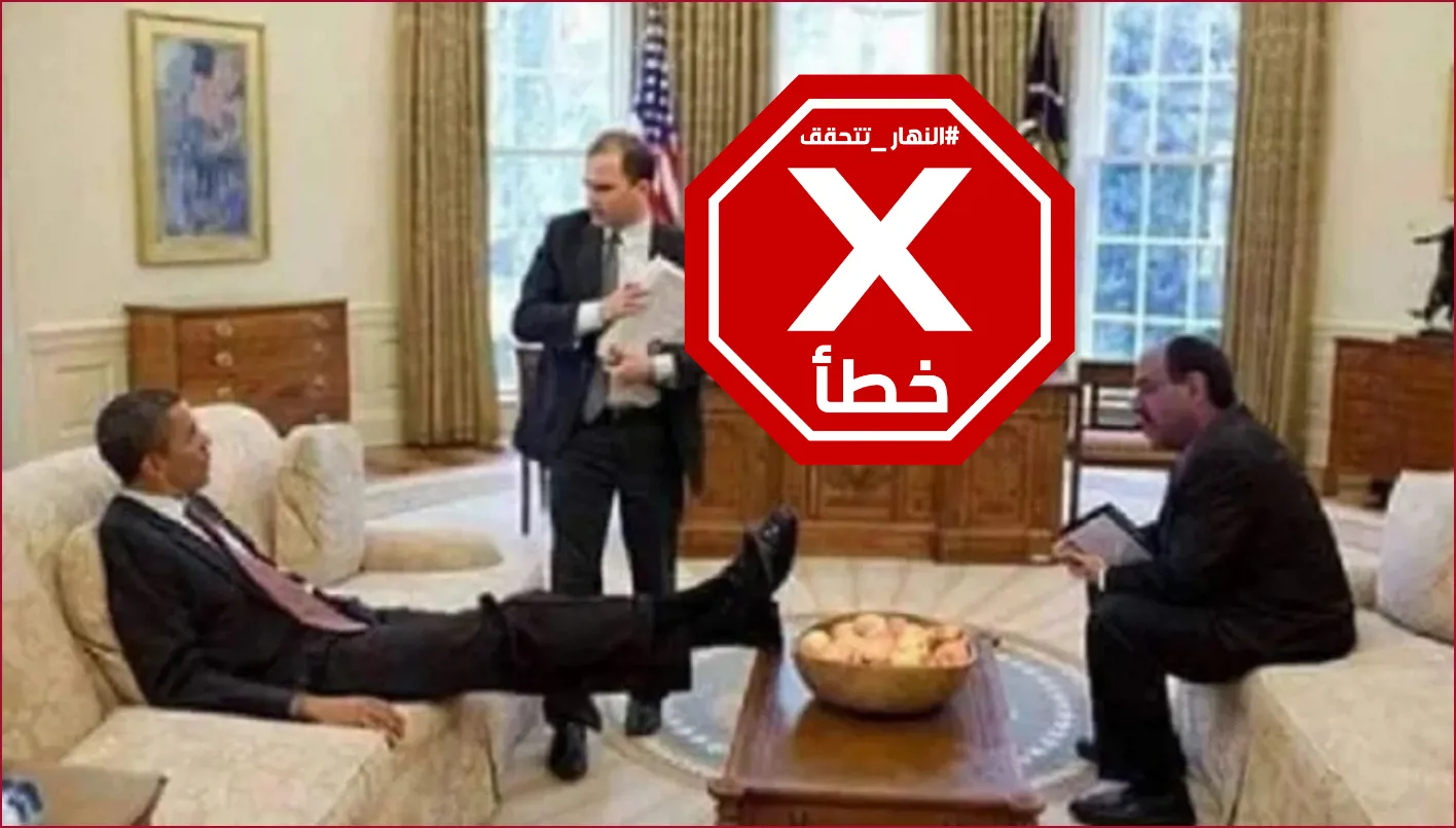 تتداول العديد من الصفحات على مواقع التواصل الاجتماعي صورة بمزاعم أنَّها تظهر الرئيس الأميركي الأسبق باراك أوباما واضعاً قدميه بشكل مهين في وجه زعيم ائتلاف "دولة القانون" ورئيس الوزراء العراقي الأسبق نوري المالكي. إلا أنَّ هذا الادّعاء خاطئ، لأن الصورة زائفة، معدّلة. FactCheck#