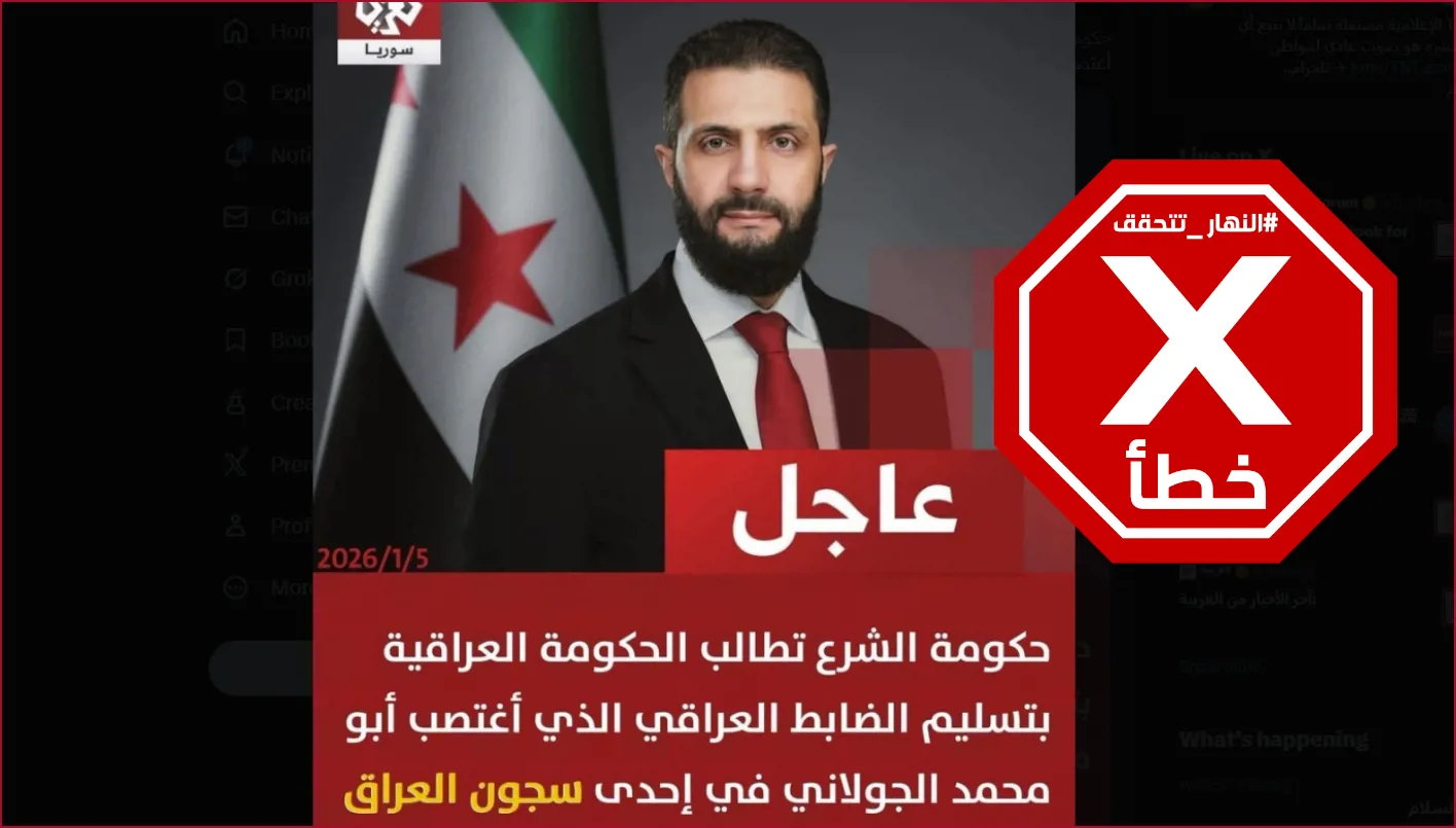 تتداول العديد من الصفحات على مواقع التواصل الاجتماعي خبراً يدّعي أنَّ "سوريا طالبت العراق بتسليم ضابطاً عراقياً كان اغتصب أبو محمد الجولاني (أحمد الشرع حاليا) يوم كان في العراق". إلا أنَّ هذا الخبر مختلق، والقالب الإخباري المتناقل معدّل. FactCheck#