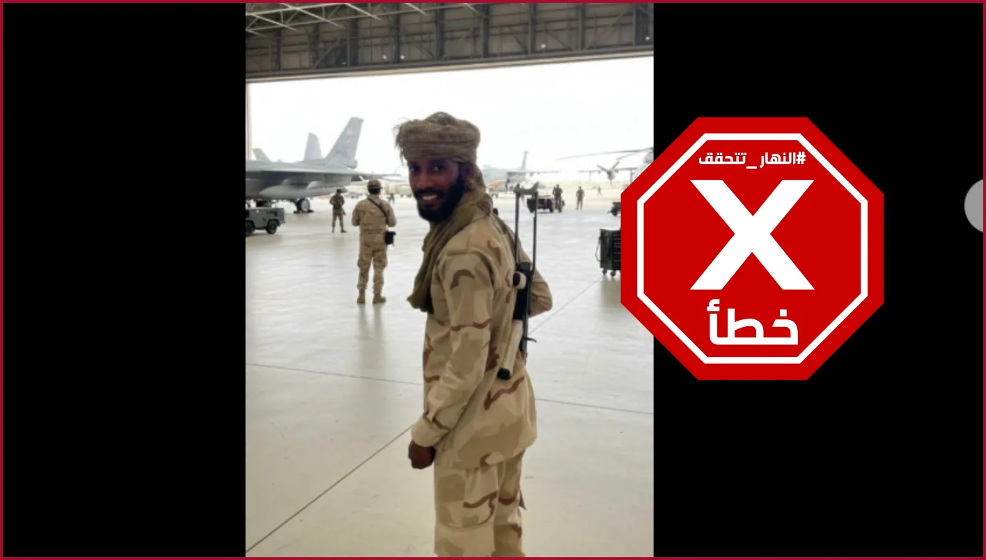 تظهر الصورة جنديا بزي عسكري مموه يحمل سلاحا، ويقف تحت مظلة خرسانية بالقرب من طائرات حربية. وكتب معها أحد الحسابات (من دون تدخل): "خبر عاجل- طيران حكومة تأسيس الآن في نيالا شغل جد".