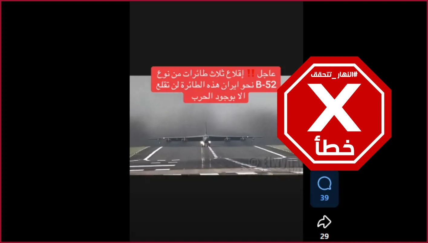 في الادّعاء المتداول، فيديو يظهر طائرة حربية على مدرج خلال إقلاعها. وأرفق بتعليق (من دون تدخّل): "عاجل- إقلاع ثلاث طائرات من نوع 52-B نحو ایران. وهذه الطائرات لا تقلع الا في حال حصول الحرب".