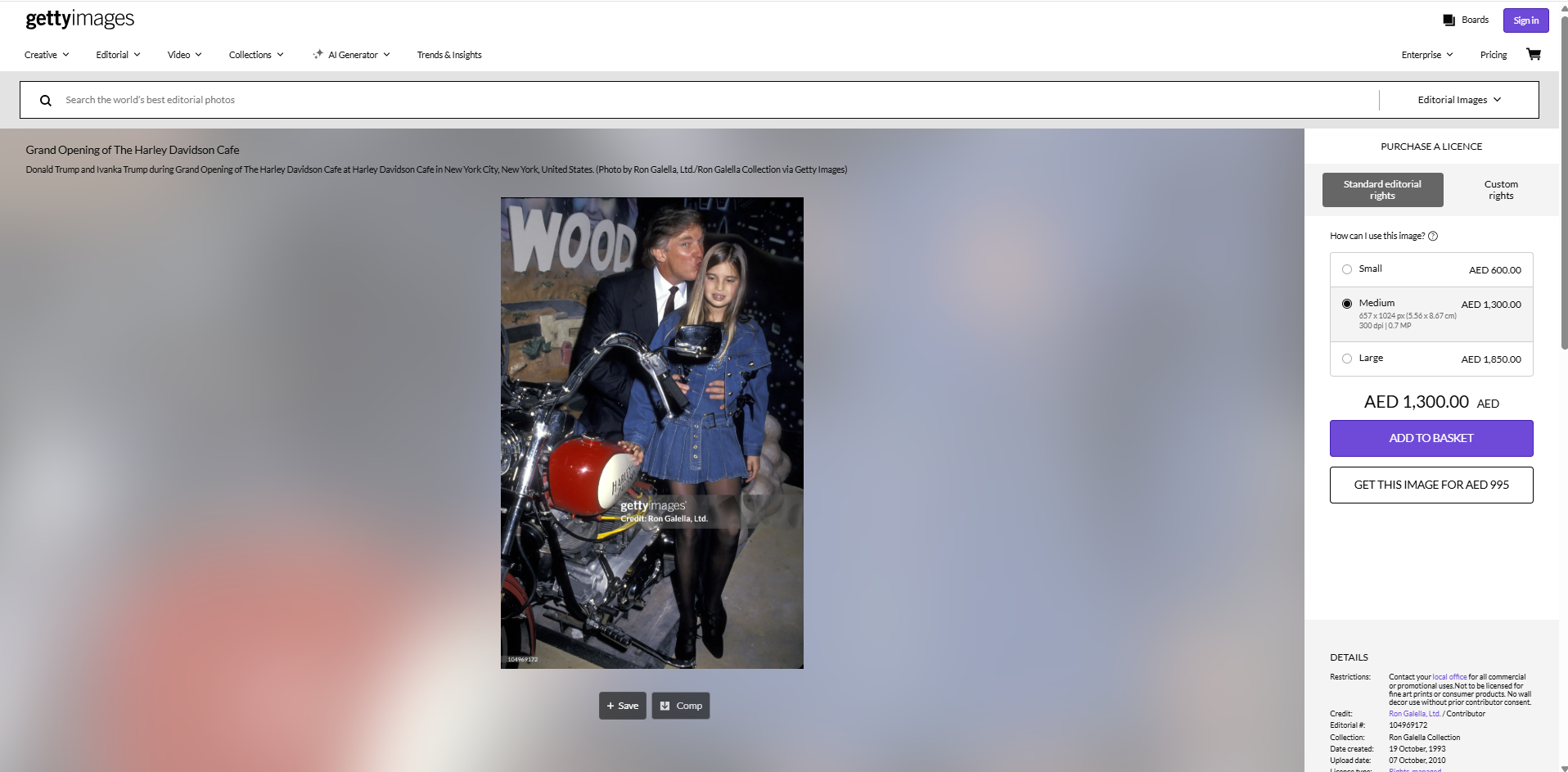فالبحث العكسي يضع أولا امامنا الصورة الاصلية لترامب مؤرشفة في موقع وكالة غيتي ايماجيز Getty Images، في 19 تشرين الاول 1993، مع شرح انها تظهره "مع ابنته ايفانكا، خلال الافتتاح الكبير لمقهى هارلي ديفيدسون في مدينة نيويورك، في ذلك اليوم".