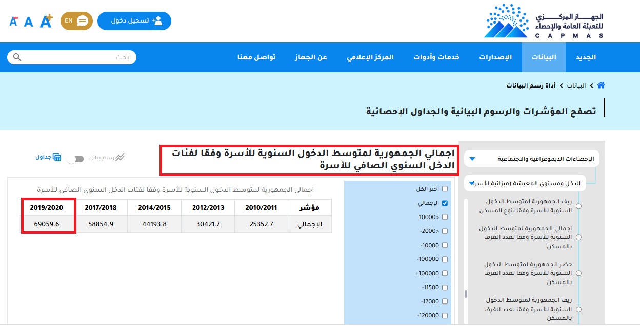 وكان آخر تحديث للبيانات الخاصة بمتوسط دخل الأسرة (عموما بدون تحديد عدد أفرادها) على مستوى الجمهورية، وفقا للموقع الرسمي للجهاز، في العام المالي 2019/ 2020.