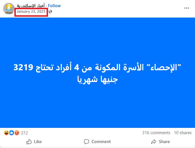 يتضمن المنشور تصريحا منسوبا الى الجهاز المركزي للتعبئة العامة والإحصاء، وجاء فيه (من دون تدخل): "الإحصاء: الأسرة المكونة من 4 أفراد تحتاج شهريا إلى 3219 جنيها مصريا". وحصد المنشور تعليقات ومشاركات كبيرة.