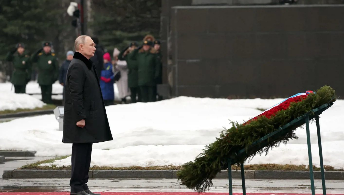 بوتين يحضر مراسم وضع إكليل الزهور على النصب التذكاري "الوطن الأم" في مقبرة بيسكاريوفسكوي (أ ف ب).