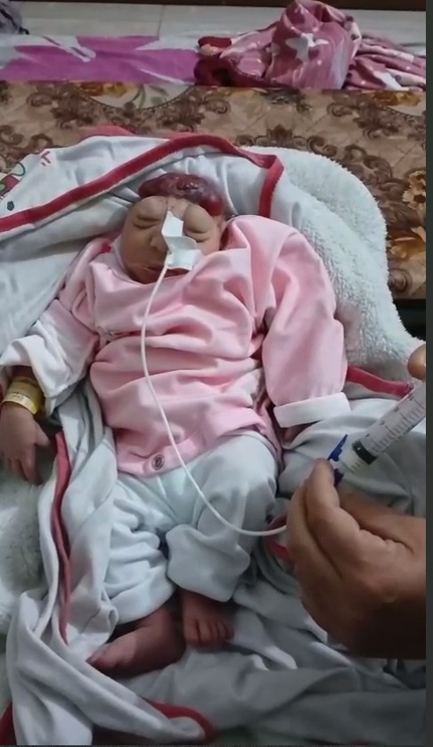 وأظهرت مقاطع فيديو وصور توثق حالة الطفلة برأس دون دماغ، حيث تنتهي الجمجمة إلى ما فوق العينين فقط.