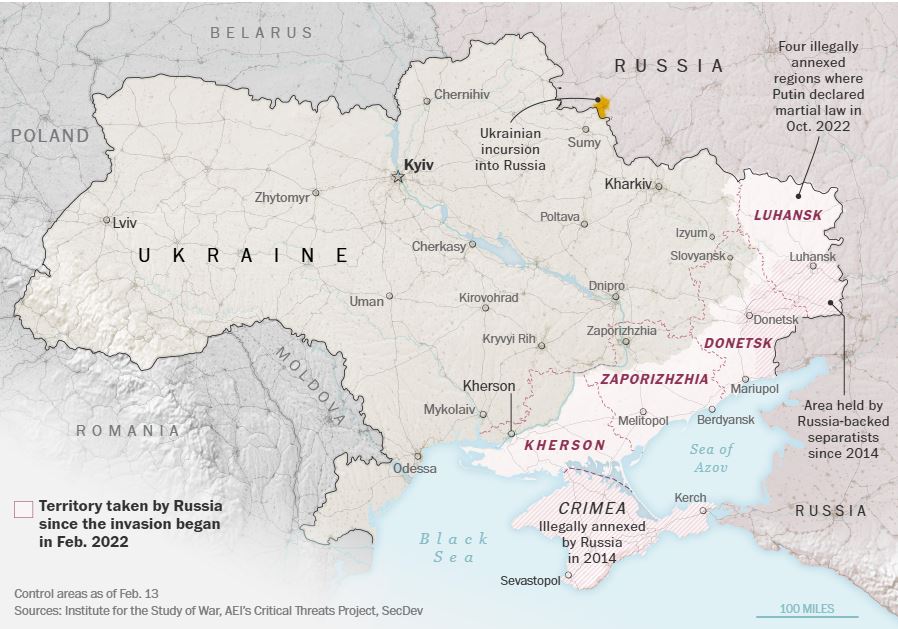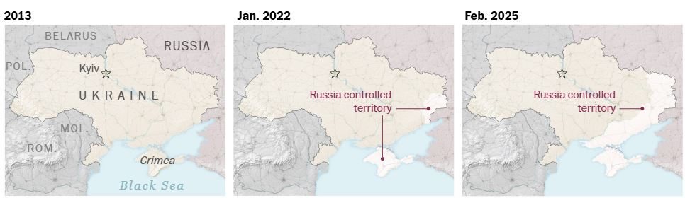 غزا بوتين أوكرانيا في عام 2022 على أمل الاستيلاء على كييف وإحداث تغيير في النظام. وقد فشل هذا الهدف، وتمكنت أوكرانيا من استعادة بعض الأراضي التي استولت عليها روسيا. لكن موسكو لا تزال تسيطر على حوالي 20% من أراضي أوكرانيا.