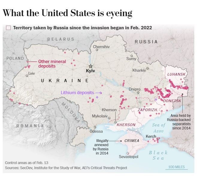 ما هو معروف هو أن ترامب مهتم بتأمين الوصول إلى المعادن الأرضية النادرة في أوكرانيا. فبعضها لا يزال تحت السيطرة الأوكرانية والبعض الآخر استولت عليه روسيا بالفعل. ويقع أحد احتياطيات الليثيوم الرئيسية التي لا تزال تحت سيطرة أوكرانيا على بعد حوالي 10 أميال فقط من خط المواجهة. وقد أثرت رغبة روسيا في السيطرة على هذه الموارد على قراراتها في ساحة المعركة.