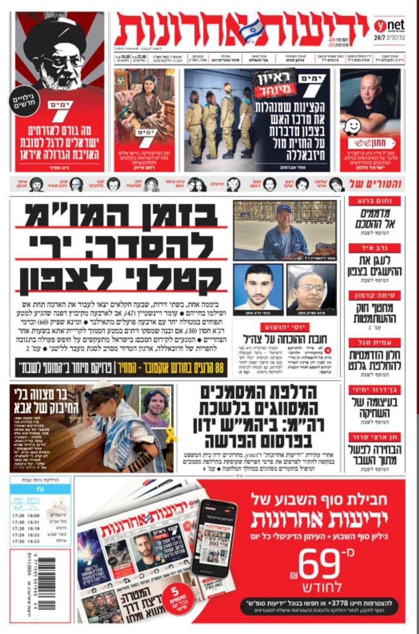 خرجت صحيفة "يديعوت أحرونوت" اليوم بغلاف يحمل عنواناً حول مفاوضات وقف إطلاق النار على وَقع القتال في الشمال. وكتبت: "أثناء المفاوضات للتوصل إلى اتفاق: إطلاق نار قاتل باتجاه الشمال".