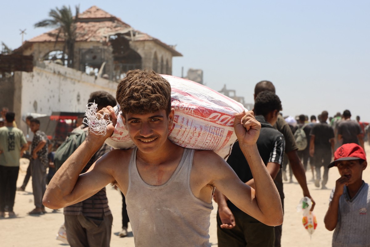 وفي خان يونس في جنوب القطاع، ركض الغزيون نحو شاحنة كانت محملة أكياس الدقيق.