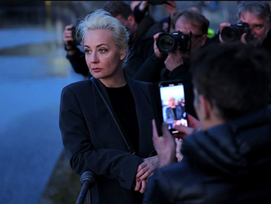بعد شهر من وفاة أليكسي نافالني، زعيم المعارضة الروسية، في سجن عقابي بعيد، أدلت زوجته يوليا بصوتها في الانتخابات الرئاسية الروسية في السفارة الروسية في برلين، ألمانيا.