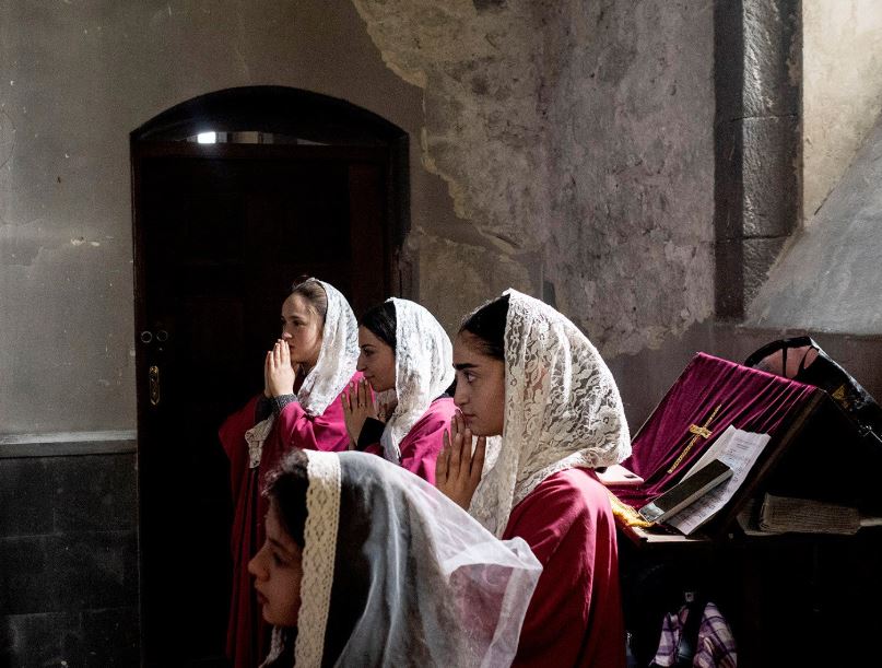 في الصورة لاجئون في كنيسة في غوريس، أرمينيا.