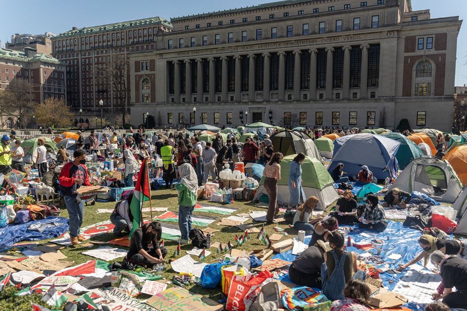 بدأ طلاب مؤيدون للفلسطينيين في جامعة كولومبيا في نيويورك مخيماً للاحتجاج على تصرفات إسرائيل في غزة. وأعاد المحتجون بناء المخيم بعد أن أخلاه رجال الشرطة في 18 نيسان. وانضمّ الآلاف إلى احتجاجات مماثلة في جامعات في أميركا وأوروبا.
