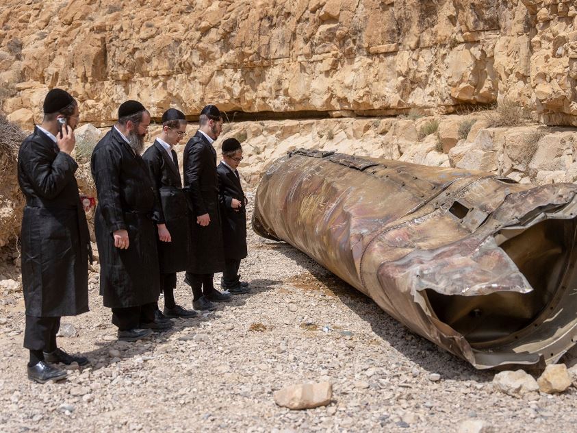 ينظر اليهود المتديّنون إلى بقايا صاروخ باليستي إيراني تمّ اعتراضه في الصحراء الإسرائيلية في 28 نيسان. كان الصاروخ جزءًا من هجوم انتقامي للغارة الجوية الإسرائيلية على السفارة الإيرانية في سوريا في الأول من نيسان، والتي أسفرت عن مقتل العديد من الضباط العسكريين الإيرانيين.