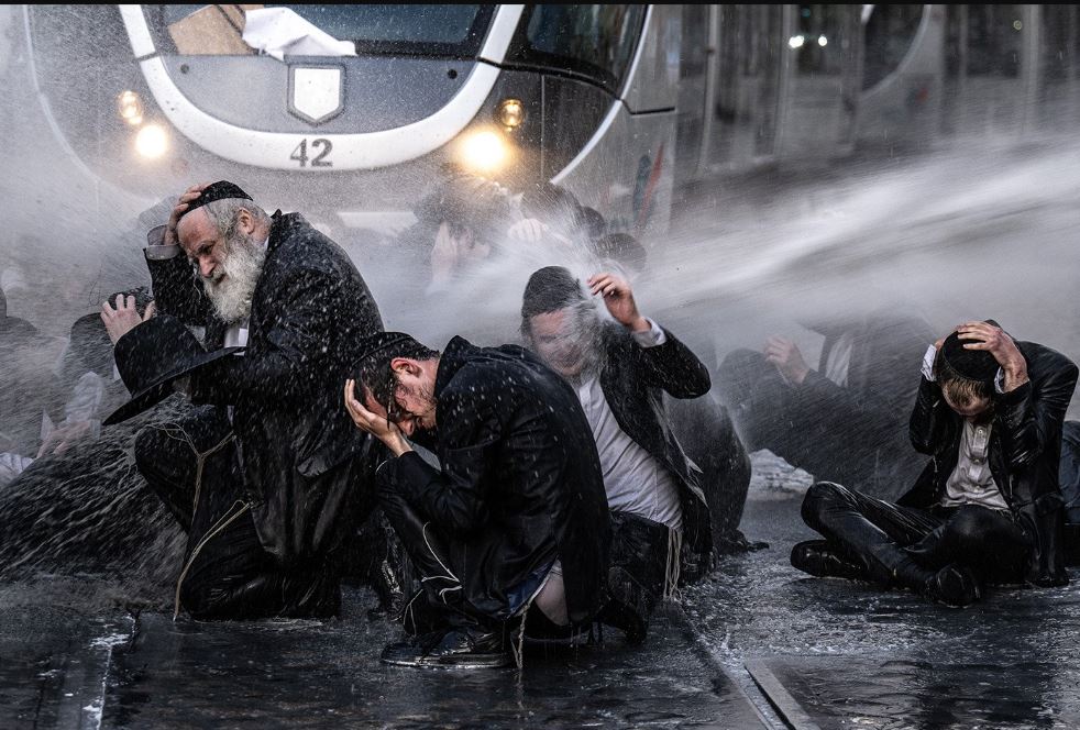 الشرطة الإسرائيلية تطلق مدافع المياه على اليهود المتشدّدين الذين كانوا يحتجون في القدس بعد أن قضت المحكمة العليا الإسرائيلية بعدم إعفائهم من الخدمة العسكرية.