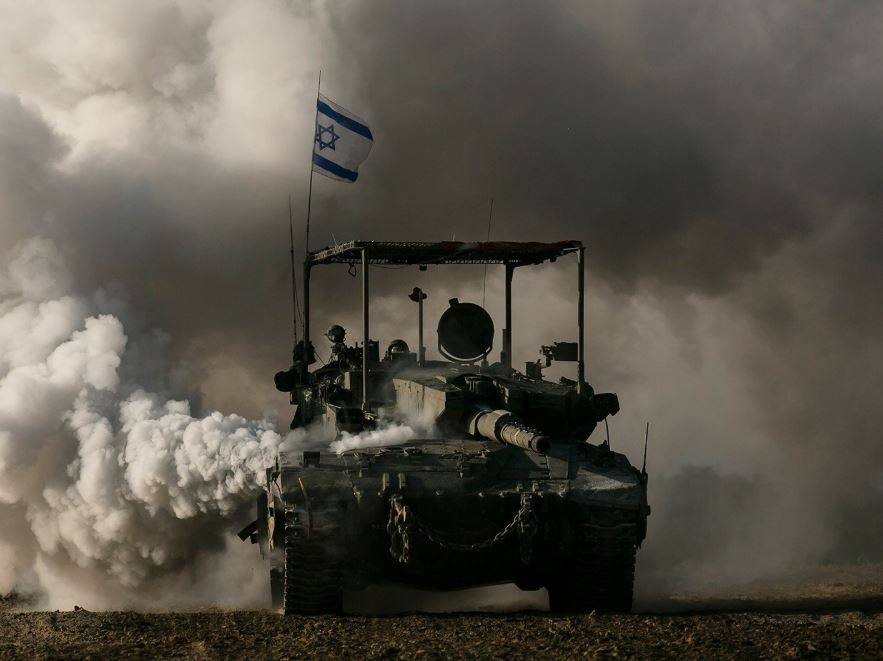 دبابة إسرائيلية تتحرّك على طول الحدود مع قطاع غزة. بين كانون الأول (ديسمبر) 2023 ونيسان (أبريل) 2024، كان تركيز الهجوم على خان يونس، ثاني مدن قطاع غزة.