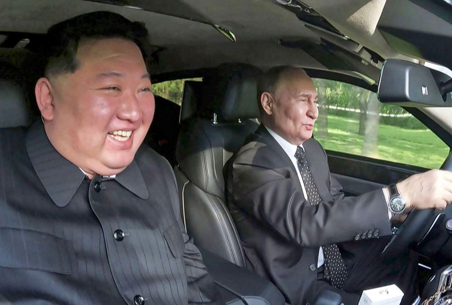 انسجم بوتين بشكل رائع مع رئيس كوريا الشمالية كيم جونغ أون، في أول زيارة له إلى البلاد منذ ما يقرب الـ 25 عاماً. وبعد توقيع اتفاقية دفاع متبادل، أهدى بوتين حليفه سيارة ليموزين روسية الصنع من طراز "أوروس" قاما بجولة بها في حديقة عامة.