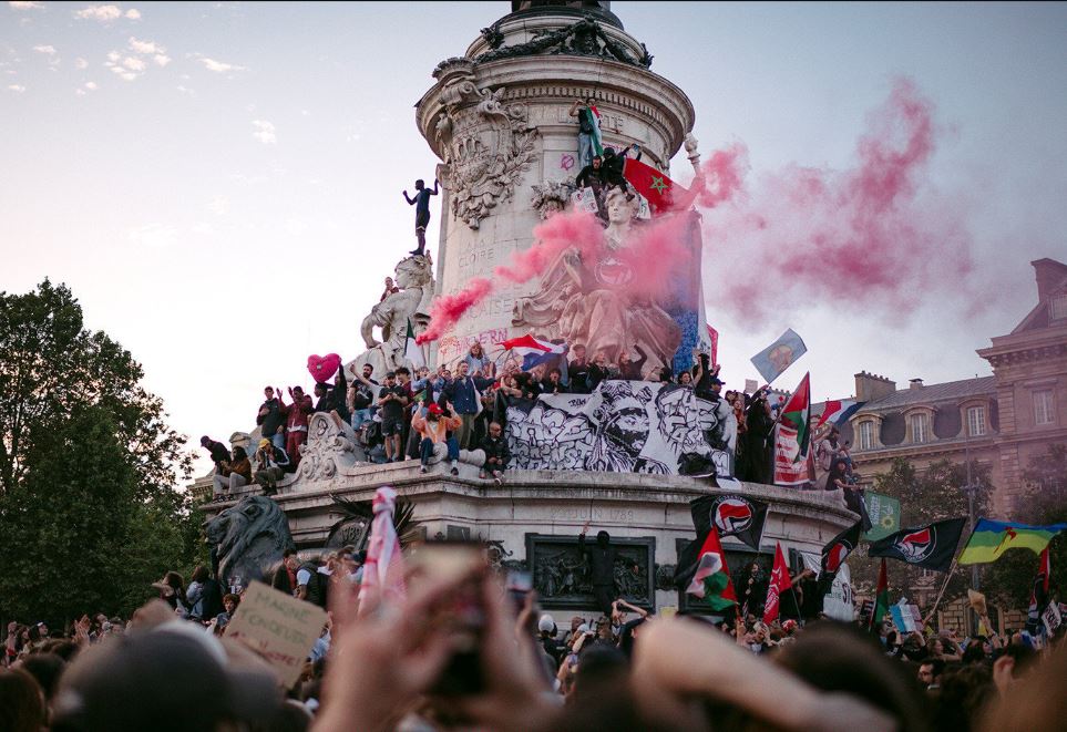 يحتفل اليساريون الباريسيون بعد فوز تحالف يساري بأكبر عدد من المقاعد (ولكن دون أغلبية مطلقة) في الجولة الثانية من الانتخابات البرلمانية في فرنسا في 7 تموز.