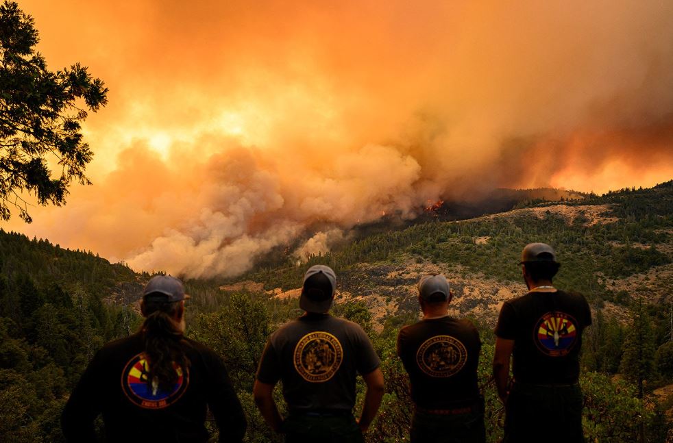 رجال الإطفاء يراقبون ألسنة النيران وهي تلتهم الغابات بالقرب من مدينة تشيكو في شمال كاليفورنيا، حيث اضطرّ حوالي 4000 شخص إلى الفرار من منازلهم.