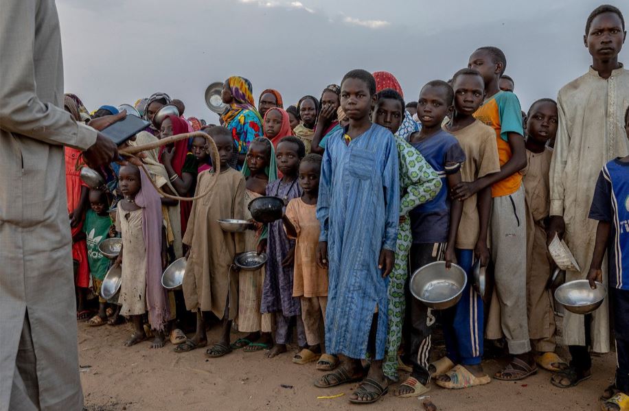 في أحد مخيمات اللاجئين السودانيين في تشاد، رجل يحمل سوطاً يحاول السيطرة على مجموعة من الأطفال أثناء انتظارهم للطعام. أكثر من 12 مليون شخص نزحوا من منازلهم في السودان منذ بداية الحرب الأهلية في نيسان 2023.