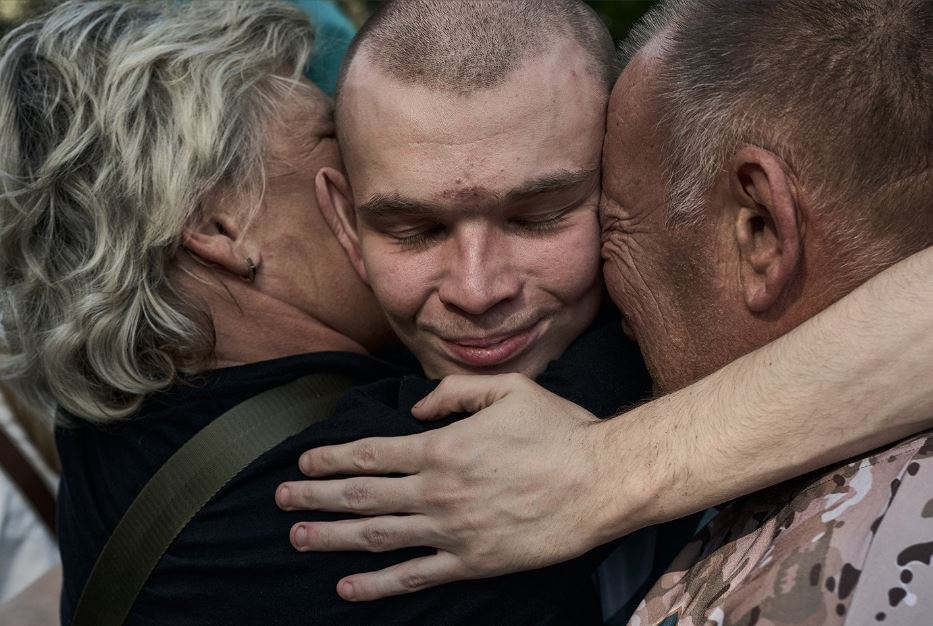 أسير حرب أوكراني سابق يحتضن أسرته بعد إطلاق سراحه من معسكر روسي. وصل أكثر من 200 جندي روسي وأوكراني إلى وطنه بعد عملية تبادل الأسرى التي توسطت فيها الإمارات العربية المتحدة.