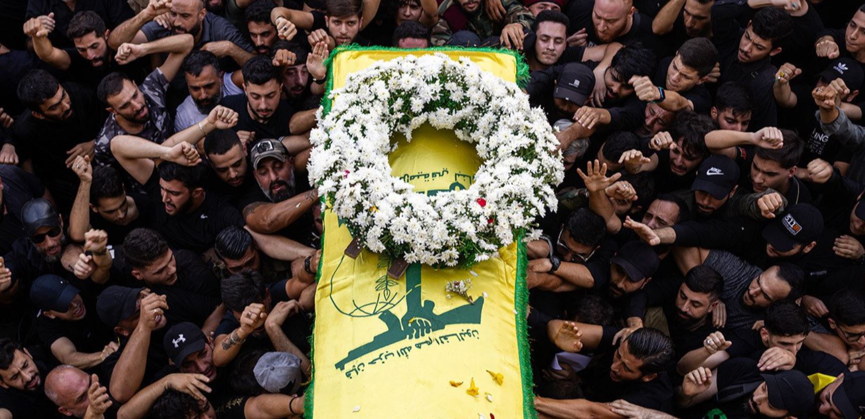 جنازة في لبنان لأحد عناصر "حزب الله" الذي قُتل عندما انفجر جهاز البيجر الخاص به. في 17 و18 أيلول، قامت إسرائيل بتفجير آلاف الأجهزة التي تعود لعناصر "حزب الله". وأسفرت العملية عن مقتل العشرات وجرح الآلاف.